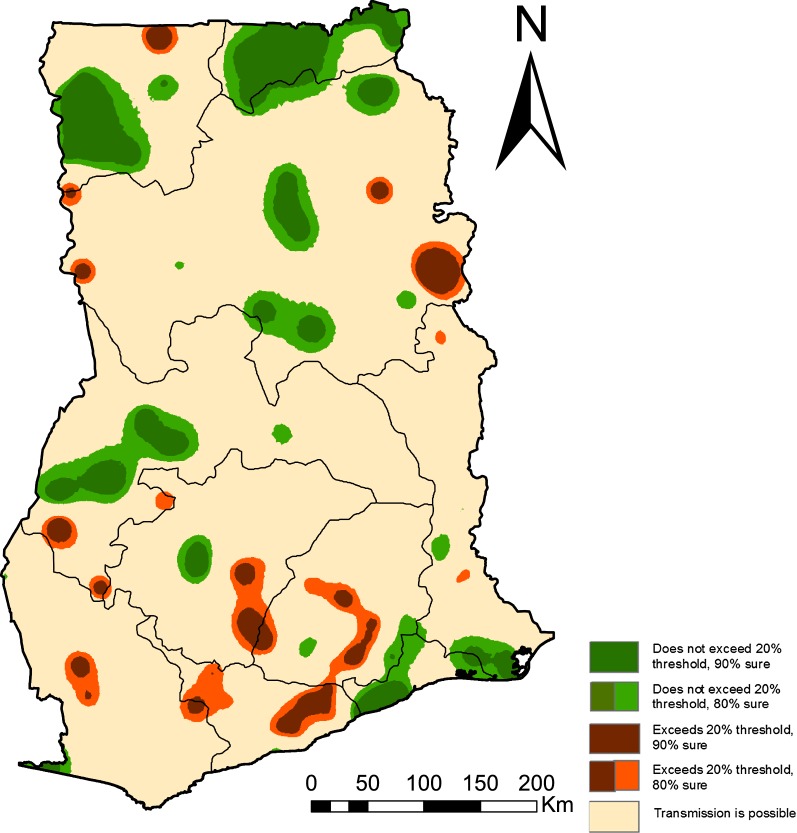 Conclusion: The risk maps indicate the spatial heterogeneity of malaria prevalence. The high resolution maps can serve as an effective tool in the identification of locations that require targeted interventions by programme implementers; this is key and relevant for reducing malaria burden in Ghana.