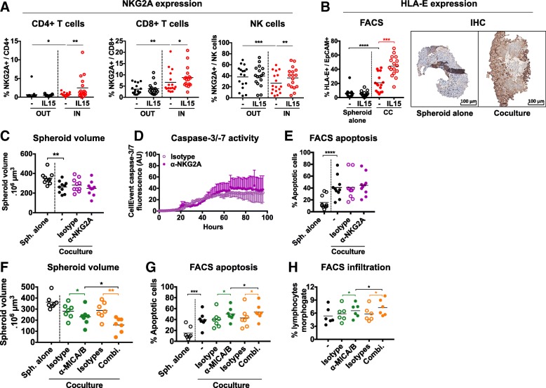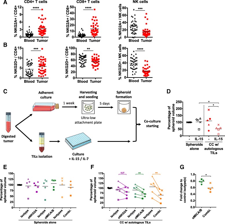 Results: We showed that allogeneic T and NK cells rapidly infiltrated cell line-derived spheroids, inducing immune-mediated tumor cell apoptosis and spheroid destruction. NKG2D, a key activator of cytotoxic responses, was engaged on infiltrating cells. We thus assessed the therapeutic potential of an antibody targeting the specific ligands of NKG2D, MICA and MICB, in this system. Anti-MICA/B enhanced immune-dependent destruction of tumor spheroid by driving an increased NK cells infiltration and activation. Interestingly, tumor cells reacted to immune infiltration by upregulating HLA-E, ligand of the inhibitory receptor NKG2A expressed by CD8 and NK cells. NKG2A was increased after anti-MICA/B treatment and, accordingly, combination of anti-MICA/B and anti-NKG2A was synergistic. These observations were ultimately confirmed in a clinical relevant model of coculture between CRC patients-derived spheroids and autologous tumor-infiltrating lymphocytes.