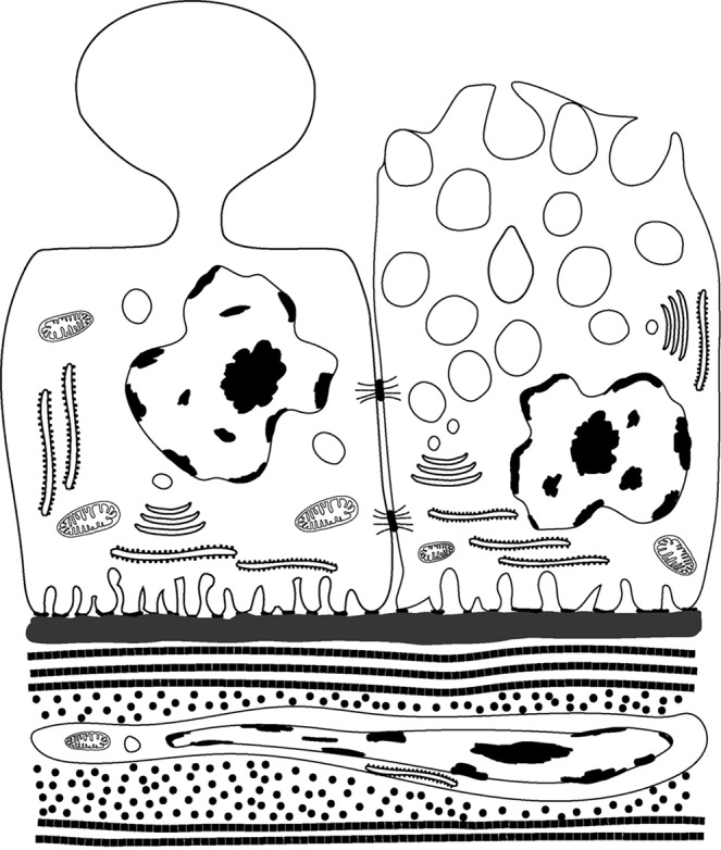 The structure and function of normal human prostate is still not fully understood. Herein, we concentrate on the different cell types present in normal prostate, describing some previously unreported types and provide evidence that prostasomes are primarily produced by apocrine secretion. Patients (n = 10) undergoing TURP were prospectively consented based on their having a low risk of harbouring CaP. Scanning electron microscopy and transmission electron microscopy was used to characterise cell types and modes of secretion. Zinc levels were determined using Inductively Coupled Plasma Mass Spectrometry. Although merocrine secretory cells were noted, the majority of secretory cells appear to be apocrine; for the first time, we clearly show high-resolution images of the stages of aposome secretion in human prostate. We also report a previously undescribed type of epithelial cell and the first ultrastructural image of wrapping cells in human prostate stroma. The zinc levels in the tissues examined were uniformly high and X-ray microanalysis detected zinc in merocrine cells but not in prostasomes. We conclude that a significant proportion of prostasomes, possibly the majority, are generated via apocrine secretion. This finding provides an explanation as to why so many large proteins, without a signal peptide sequence, are present in the prostatic fluid.