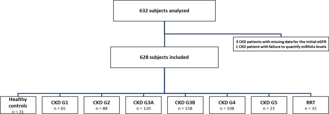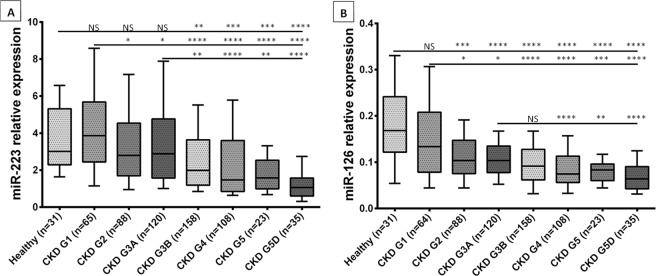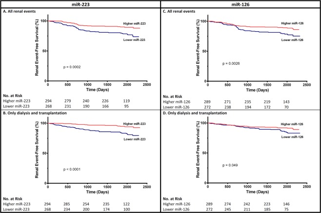 Several microRNAs (miRNAs) have been linked to chronic kidney disease (CKD) mortality, cardiovascular (CV) complications and kidney disease progression. However, their association with clinical outcomes remains poorly evaluated. We used real-time qPCR to measure serum levels of miR-126 and miR-223 in a large cohort of 601 CKD patients (CKD stage G1 to G5 patients or on renal replacement therapy - CKD G5D) from Ghent University Hospital and 31 healthy controls. All-cause mortality and cardiovascular and renal events were registered as endpoints over a 6 year follow-up period. miR-126 levels were significantly lower from CKD stage G2 on, compared to controls. The serum levels of miR-223 were significantly lower from CKD stage G3B on. When considering overall mortality, patients with levels of either miR-126 or miR-223 below the median had a lower survival rate. Similar results were observed for CV and renal events. The observed link between the two miRNAs' seric levels and mortality, cardiovascular events or renal events in CKD appears to depend on eGFR. However, this does not preclude their potential role in the pathophysiology of CKD. In conclusion, CKD is associated with a decrease in circulating miR-223 and miR-126 levels.