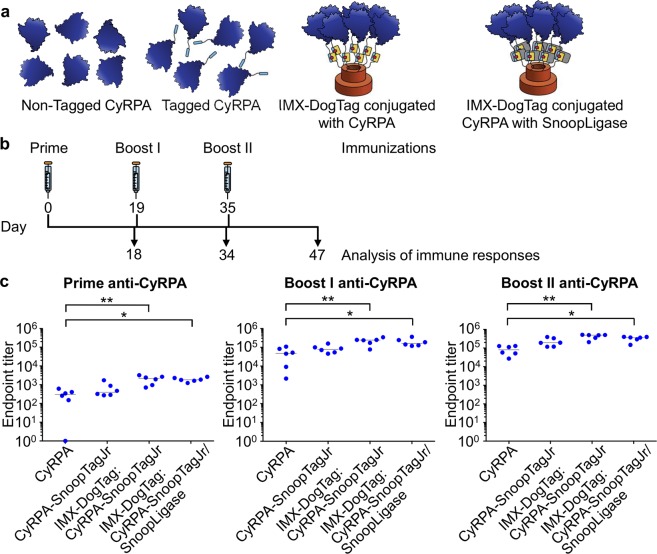 For many infectious diseases there is still no vaccine, even though potential protective antigens have been identified. Suitable platforms and conjugation routes are urgently needed to convert the promise of such antigens into broadly protective and scalable vaccines. Here we apply a newly established peptide-peptide ligation approach, SnoopLigase, for specific and irreversible coupling of antigens onto an oligomerization platform. SnoopLigase was engineered from a Streptococcus pneumoniae adhesin and enables isopeptide bond formation between two peptide tags: DogTag and SnoopTagJr. We expressed in bacteria DogTag linked to the self-assembling coiled-coil nanoparticle IMX313. This platform was stable over months at 37 °C when lyophilized, remaining reactive even after boiling. IMX-DogTag was efficiently coupled to two blood-stage malarial proteins (from PfEMP1 or CyRPA), with SnoopTagJr fused at the N- or C-terminus. We also showed SnoopLigase-mediated coupling of a telomerase peptide relevant to cancer immunotherapy. SnoopLigase-mediated nanoassembly enhanced the antibody response to both malaria antigens in a prime-boost model. Including or depleting SnoopLigase from the conjugate had little effect on the antibody response to the malarial antigens. SnoopLigase decoration represents a promising and accessible strategy for modular plug-and-display vaccine assembly, as well as providing opportunities for robust nanoconstruction in synthetic biology.