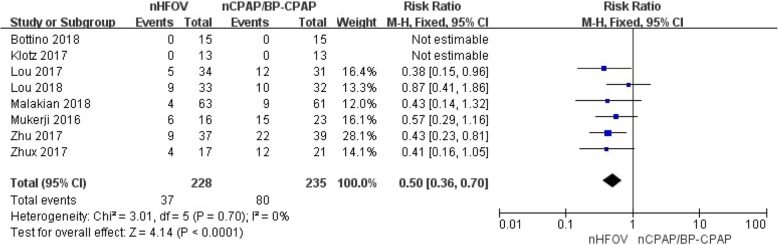 Conclusions: Our meta-analysis of RCTs suggests that nHFOV, as respiratory support in preterm infants, significantly remove carbon dioxide and reduce the risk of intubation compared with nCPAP/BP-CPAP. The appropriate parameter settings for different types of noninvasive high-frequency ventilators, the effect of nHFOV in extremely preterm infants, and the long-term safety of nHFOV need to be assessed in large trials.