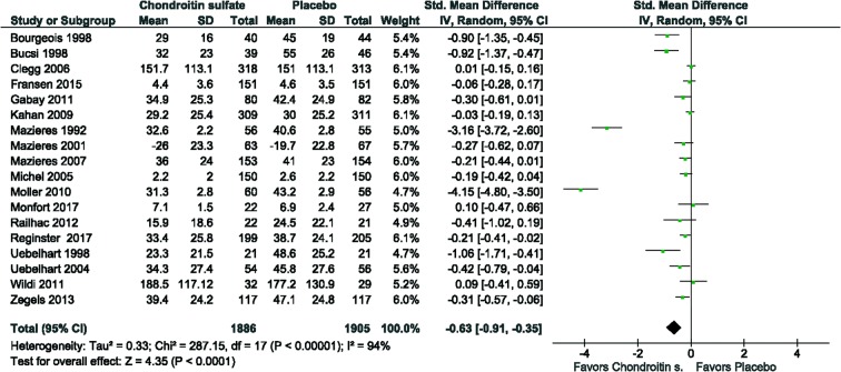 Results: The inclusion criteria yielded 18 trials. Overall, CS significantly but inconsistently reduced pain (SMD: - 0.63; 95% CI: - 0.91, - 0.35; I2 = 94%) and improved function (SMD: - 0.82; 95% CI: - 1.31, - 0.33; I2 = 95%). When limiting the analysis to studies with a low risk of bias, the pharmaceutical grade CS of IBSA origin showed a greater reduction in pain (SMD: - 0.25; 95% CI: - 0.34, - 0.16; I2 = 75%) and function (SMD: - 0.33; 95% CI: - 0.47, - 0.20; I2 = 53%, p = 0.07) compared with the other preparations (SMDPain: - 0.08; 95% CI: - 0.19, + 0.02; I2 = 20%; SMDFunction: - 0.18; 95% CI: - 0.36, +0.01; I2 = 0%). Assessing funnel plot asymmetry in the studies with a low risk of bias, we found strong correlations between the treatment effects and study size (pain: rS = 0.93; LI: rS = 0.86; p < 0.05). Ultimately, there was no residual heterogeneity in the CS effects when the smallest studies were removed from the analyses.