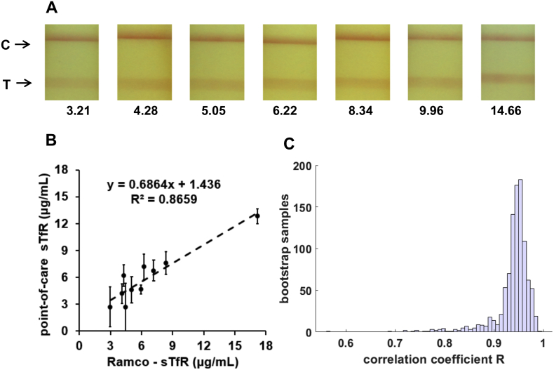 Interpretation: The analytical performance of the point-of-care sTfR screening device indicates the potential for application in home-use test kits and field settings, especially in low- and middle-income settings. An added advantage of sTfR quantification in combination with our previously reported serum ferritin diagnostics is in integration of Cook's equation as a quantitative and minimally-invasive indicator of total body iron stores. FUND: Thrasher Research Fund (Early Career Award #13379), NIH R03 EB 023190, NSF grant #1343058, and Nutrition International (project #10-8007-CORNE-01).