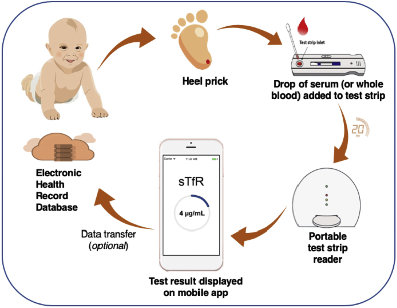 Background: Iron deficiency (ID) and anaemia are major health concerns, particularly in young children. Screening for ID based on haemoglobin (Hb) concentration alone has been shown to lack sensitivity and specificity. The American Academy of Pediatrics (AAP) recommends soluble transferrin receptor (sTfR) as a promising approach to screen for iron deficiency. However, in most settings, assessment of iron status requires access to centralized laboratories. There is an urgent need for rapid, sensitive, and affordable diagnostics for sTfR at the point-of-care.