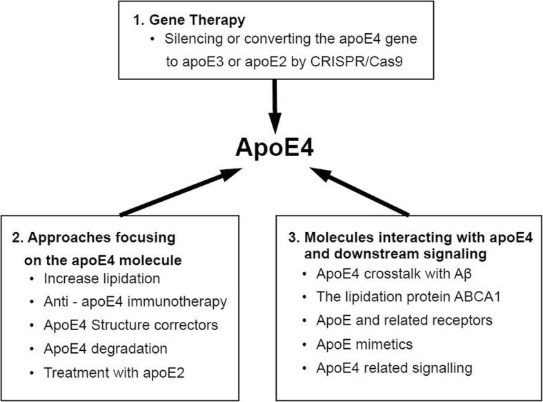 Review: This review focuses initially on the pathological effects of apoE4 in AD, as well as on the corresponding cellular and animal models and the suggested cellular and molecular mechanisms which mediate them. The second part of the review focuses on recent apoE4-targeted (from the APOE gene to the apoE protein and its interactors) therapeutic approaches that have been developed in animal models and are ready to be translated to human. Further, the issue of whether the pathological effects of apoE4 are due to loss of protective function or due to gain of toxic function is discussed herein. It is possible that both mechanisms coexist, with certain constituents of the apoE4 molecule and/or its downstream signaling mediating a toxic effect, while others are associated with a loss of protective function.
