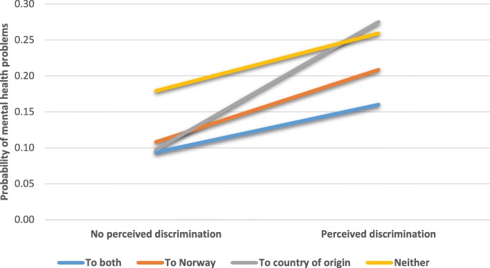 Results: Around 27% of participants reported perceived discrimination. While perceived discrimination was not associated with general health, logistic regression analyses indicated that it was associated with 1.86 higher odds of mental health problems, even after adjusting for sociodemographic and psychosocial variables. Further, interaction analyses suggested that sense of belonging and trust in others moderated the relationship. Those with higher levels of trust did not have increased odds of mental health problems when experiencing discrimination, while those with low levels of trust did. In line with rejection sensitivity theory, the association between perceived discrimination and mental health was stronger for participants who had a strong sense of belonging to their own country of origin but not to Norway compared with those who had a sense of belonging to both.
