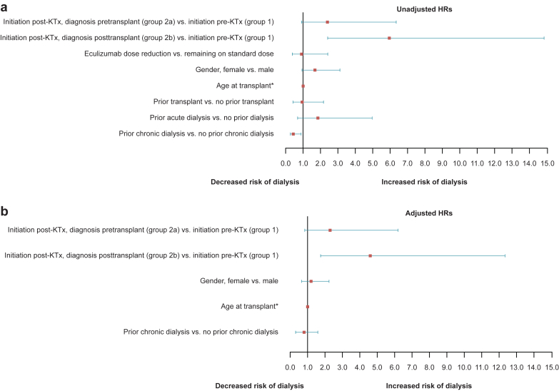 Results: Within 5 years of transplantation, 47 patients required dialysis; the risk of dialysis after transplantation was significantly increased in group 2b (hazard ratio [HR] 4.6; confidence interval [CI] 1.7-12.4) but not 2a (HR 2.3; CI 0.9-6.2). Graft function within 6 months of transplantation was significantly better in group 1 (median estimated glomerular filtration rate of 60.6 ml/min per 1.73 m2) compared with 31.5 and 9.6 ml/min per 1.73 m2 in groups 2a (P = 0.004) and 2b (P = 0.0001), respectively. One meningococcal infection (resolved with treatment) and 3 deaths (deemed unrelated to eculizumab) were reported.
