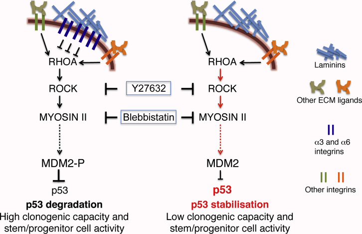 Integrins, which bind laminin, a major component of the mammary basement membrane, are strongly expressed in basal stem cell-enriched populations, but their role in controlling mammary stem cell function remains unclear. We found that stem cell activity, as evaluated in transplantation and mammosphere assays, was reduced in mammary basal cells depleted of laminin receptors containing α3- and α6-integrin subunits. This was accompanied by low MDM2 levels, p53 stabilization, and diminished proliferative capacity. Importantly, disruption of p53 function restored the clonogenicity of α3/α6-integrin-depleted mammary basal stem cells, while inhibition of RHO or myosin II, leading to decreased p53 activity, rescued the mammosphere formation. These data suggest that α3/α6-integrin-mediated adhesion plays an essential role in controlling the proliferative potential of mammary basal stem/progenitor cells through myosin II-mediated regulation of p53 and indicate that laminins might be important components of the mammary stem cell niche.