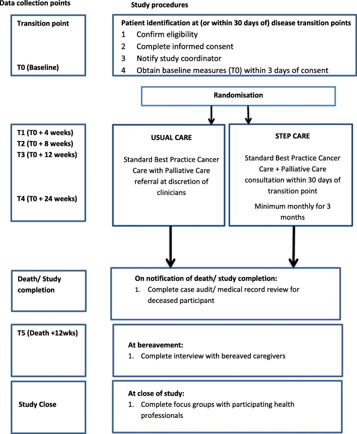 Discussion: The research will test the feasibility of standardised palliative care introduction based on illness transitions and provide guidance on subsequent development of phase 3 studies of integration. This will directly address the current uncertainty about palliative care timing.