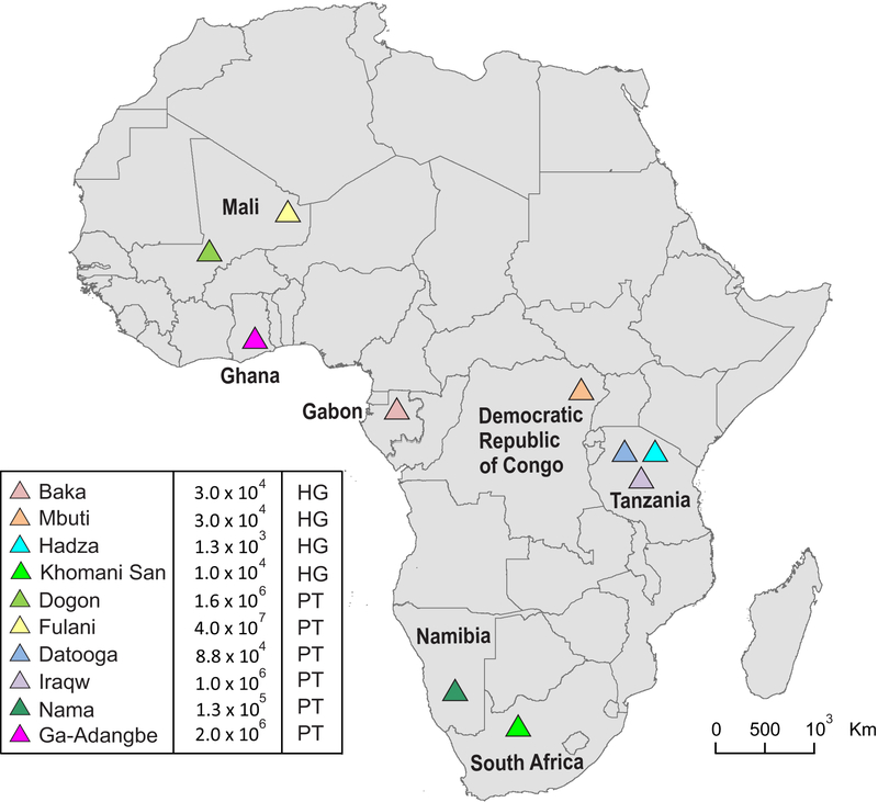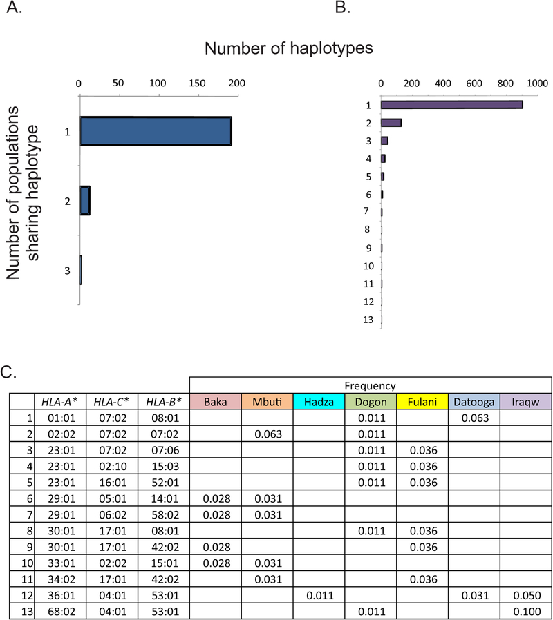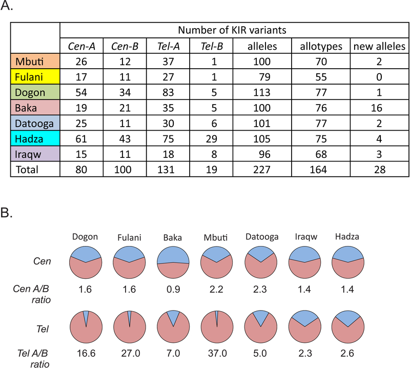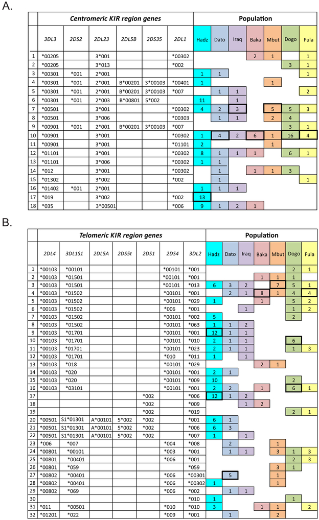 HLA class I and KIR sequences were determined for Dogon, Fulani, and Baka populations of western Africa, Mbuti of central Africa, and Datooga, Iraqw, and Hadza of eastern Africa. Study of 162 individuals identified 134 HLA class I alleles (41 HLA-A, 60 HLA-B, and 33 HLA-C). Common to all populations are three HLA-C alleles (C1+C*07:01, C1+C*07:02, and C2+C*06:02) but no HLA-A or -B Unexpectedly, no novel HLA class I was identified in these previously unstudied and anthropologically distinctive populations. In contrast, of 227 KIR detected, 22 are present in all seven populations and 28 are novel. A high diversity of HLA A-C-B haplotypes was observed. In six populations, most haplotypes are represented just once. But in the Hadza, a majority of haplotypes occur more than once, with 2 having high frequencies and 10 having intermediate frequencies. The centromeric (cen) part of the KIR locus exhibits an even balance between cenA and cenB in all seven populations. The telomeric (tel) part has an even balance of telA to telB in East Africa, but this changes across the continent to where telB is vestigial in West Africa. All four KIR ligands (A3/11, Bw4, C1, and C2) are present in six of the populations. HLA haplotypes of the Iraqw and Hadza encode two KIR ligands, whereas the other populations have an even balance between haplotypes encoding one and two KIR ligands. Individuals in these African populations have a mean of 6.8-8.4 different interactions between KIR and HLA class I, compared with 2.9-6.5 for non-Africans.