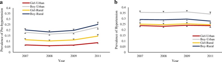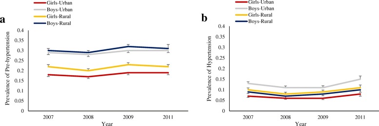 Results: Using the definition of pre-hypertension and hypertension presented by the seventh Joint National Committee (JNC-VII) for adolescents, after adjusting for confounders, the prevalence of pre-hypertension changed in both urban (boys:28.96% to 29.24% and girls:18.33% to 20.06%) and rural (boys 31.58% to 32.05% and girls 22.25% to 24.13%) areas over the study duration. Non-significant rising prevalence of hypertension was also observed in boys and girls of both regions (urban 12.76% to 15.04% and 8.02% to 9.06%; rural 9.95% to 11.79% and 10.35% to 11.60%, for boys and girls respectively). The adjusted prevalence ratios (PRs) of pre-hypertension (2.16; 95% CI 1.68-2.79 and 1.92, 95% CI 1.57-2.34, in urban and rural, respectively) and hypertension (2.40; 95% CI 1.65-3.51 and 1.82, 95% CI 1.36-2.45, in urban and rural, respectively) were higher in boys than girls. Comparing the adjusted PRs of pre-hypertension and hypertension in urban versus rural areas, in both genders, showed higher PRs of pre-hypertension in rural girls (1.33, 95% CI 1.01-1.75).