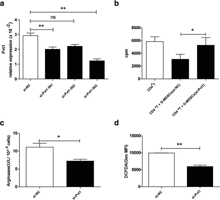 Methods: MDSCs or granulocytic MDSCs (G-MDSCs) were isolated by microbeads and flow cytometry. Bone marrow derived G-MDSCs were induced by IL-6 and GM-CSF. The expression of lncRNA Pvt1 was measured by qRT-PCR. Specific siRNA was used to knockdown the expression of lncRNA Pvt1 in G-MDSCs.