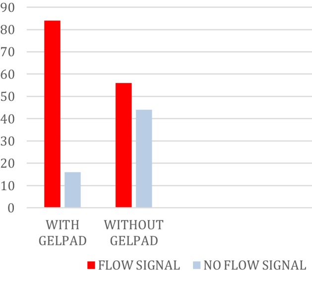 Results: Peri- or intra-lesional flow was demonstrated in 56% of cases without and in 84% of cases with interposition of a gel stand-off pad; moreover, a statistically significant difference (p value < 0.001) was observed at Chi-square test in the identification of the flow pattern between the use and no use of the pad.