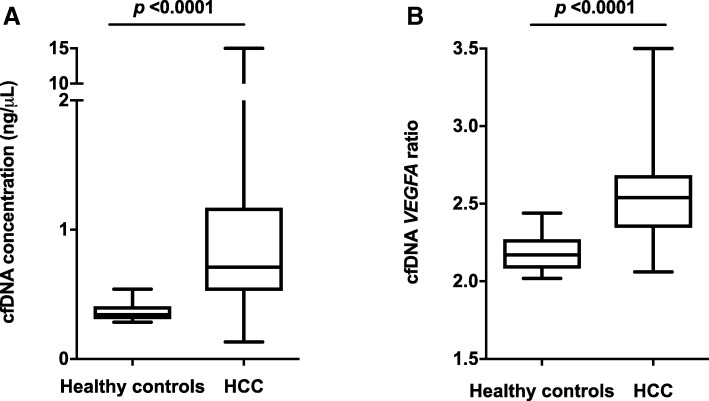 Results: The cfDNA concentrations were significantly higher in HCC patients than in healthy controls (0.71 vs. 0.34 ng/μL; P < 0.0001). Patients who did not achieve disease control with sorafenib had significantly higher cfDNA levels (0.82 vs. 0.63 ng/μL; P = 0.006) and I-scores (3405 vs. 1024; P = 0.0017) than those achieving disease control. The cfDNA-high group had significantly worse TTP (2.2 vs. 4.1 months; HR = 1.71; P = 0.002) and OS (4.1 vs. 14.8 months; HR = 3.50; P < 0.0001) than the cfDNA-low group. The I-score-high group had poorer TTP (2.2 vs. 4.1 months; HR = 2.09; P < 0.0001) and OS (4.6 vs. 14.8 months; HR = 3.35; P < 0.0001). In the multivariable analyses, the cfDNA remained an independent prognostic factor for OS (P < 0.0001), and the I-score for both TTP (P = 0.011) and OS (P = 0.010). The VEGFA ratio was not significantly associated with treatment outcomes.