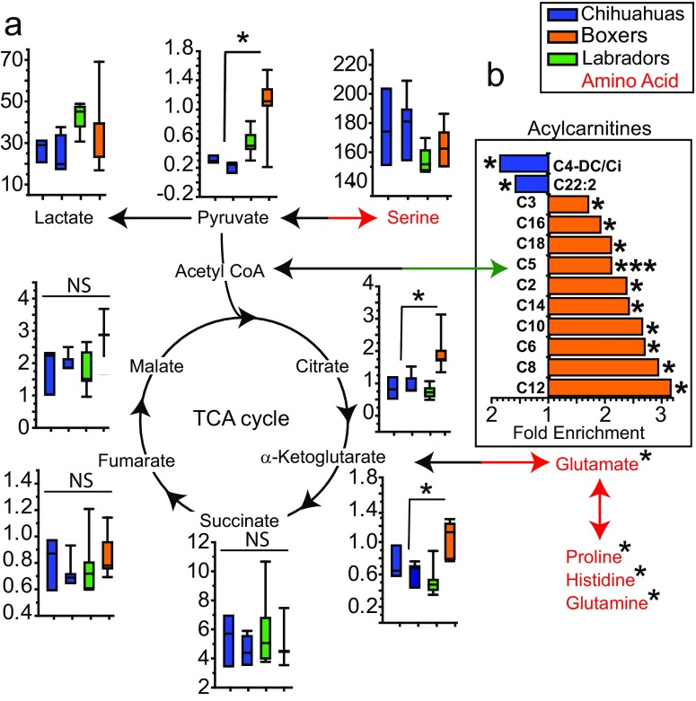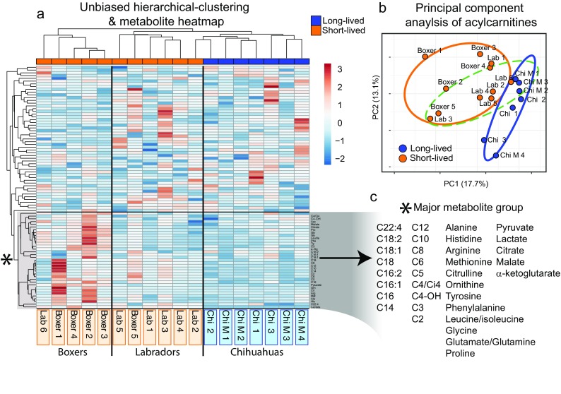 The first domesticated companion animal, the dog, is currently represented by over 190 unique breeds. Across these numerous breeds, dogs have exceptional variation in lifespan (inversely correlated with body size), presenting an opportunity to discover longevity-determining traits. We performed a genome-wide association study on 4169 canines representing 110 breeds and identified novel candidate regulators of longevity. Interestingly, known functions within the identified genes included control of coat phenotypes such as hair length, as well as mitochondrial properties, suggesting that thermoregulation and mitochondrial bioenergetics play a role in lifespan variation. Using primary dermal fibroblasts, we investigated mitochondrial properties of short-lived (large) and long-lived (small) dog breeds. We found that cells from long-lived breeds have more uncoupled mitochondria, less electron escape, greater respiration, and capacity for respiration. Moreover, our data suggest that long-lived breeds have higher rates of catabolism and β-oxidation, likely to meet elevated respiration and electron demand of their uncoupled mitochondria. Conversely, cells of short-lived (large) breeds may accumulate amino acids and fatty acid derivatives, which are likely used for biosynthesis and growth. We hypothesize that the uncoupled metabolic profile of long-lived breeds likely stems from their smaller size, reduced volume-to-surface area ratio, and therefore a greater need for thermogenesis. The uncoupled energetics of long-lived breeds lowers reactive oxygen species levels, promotes cellular stress tolerance, and may even prevent stiffening of the actin cytoskeleton. We propose that these cellular characteristics delay tissue dysfunction, disease, and death in long-lived dog breeds, contributing to canine aging diversity.