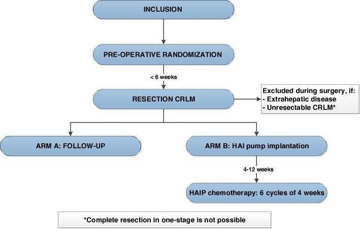 Methods: This is an open label multicenter RCT. A total of 230 patients with resectable CRLM without extrahepatic disease will be included. Only patients with a clinical risk score (CRS) of 0 to 2 are eligible, meaning: patients are allowed to have no more than two out of five poor prognostic factors (disease-free interval less than 12 months, node-positive colorectal cancer, more than 1 CRLM, largest CRLM more than 5 cm in diameter, serum Carcinoembryonic Antigen above 200 μg/L). Patients randomized to arm A undergo complete resection of CRLM without any adjuvant treatment, which is the standard of care in the Netherlands. Patients in arm B receive an implantable pump at the time of CRLM resection and start adjuvant HAIP chemotherapy 4-12 weeks after surgery, with 6 cycles of floxuridine scheduled. The primary endpoint is progression-free survival (PFS). Secondary endpoints include overall survival, hepatic PFS, safety, quality of life, and cost-effectiveness. Pharmacokinetics of intra-arterial administration of floxuridine will be investigated as well as predictive biomarkers for the efficacy of HAIP chemotherapy. In a side study, the accuracy of CT angiography will be compared to radionuclide scintigraphy to detect extrahepatic perfusion. We hypothesize that adjuvant HAIP chemotherapy leads to improved survival, improved quality of life, and a reduction of costs, compared to resection alone.