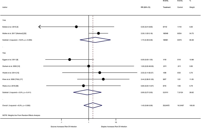 Results: In the primary analysis, patients randomized to staples had a higher risk of SSI versus those who received sutures for skin closure (RR, 2.05; 95% CI,1.38-3.06; I = 0%). However, most of the events were driven by superficial SSI, and only two deep infections were explicitly reported in total (one in each group). After a post-hoc sensitivity analysis excluded a highly influential trial with high risk of bias, the results were highly fragile, relying on a difference of only four additional events in the staples group. When we limited the analysis to RCTs with low risk of bias, no difference was found between sutures and staples in terms of SSI (RR, 1.45; 95% CI, 0.31-6.79; I = 46%). Effect sizes were consistent across subgroups (p value for subgroup interaction was not significant for elective versus trauma; hip versus knee arthroplasty; suture material; high versus middle- versus low-income settings).