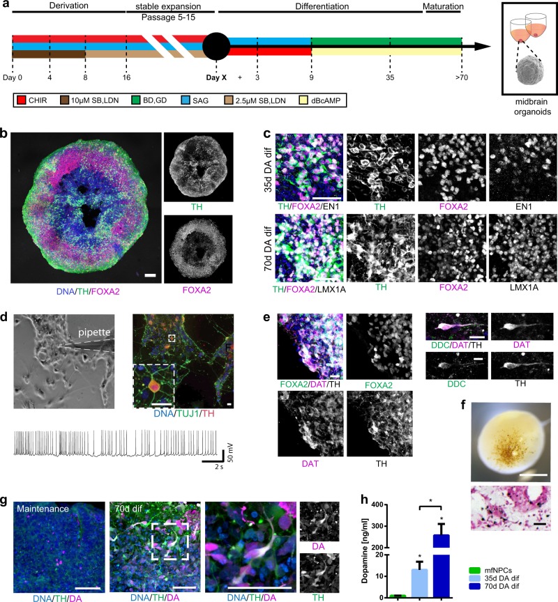 Modeling Parkinson's disease (PD) using advanced experimental in vitro models is a powerful tool to study disease mechanisms and to elucidate unexplored aspects of this neurodegenerative disorder. Here, we demonstrate that three-dimensional (3D) differentiation of expandable midbrain floor plate neural progenitor cells (mfNPCs) leads to organoids that resemble key features of the human midbrain. These organoids are composed of midbrain dopaminergic neurons (mDANs), which produce and secrete dopamine. Midbrain-specific organoids derived from PD patients carrying the LRRK2-G2019S mutation recapitulate disease-relevant phenotypes. Automated high-content image analysis shows a decrease in the number and complexity of mDANs in LRRK2-G2019S compared to control organoids. The floor plate marker FOXA2, required for mDAN generation, increases in PD patient-derived midbrain organoids, suggesting a neurodevelopmental defect in mDANs expressing LRRK2-G2019S. Thus, we provide a robust method to reproducibly generate 3D human midbrain organoids containing mDANs to investigate PD-relevant patho-mechanisms.