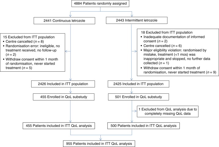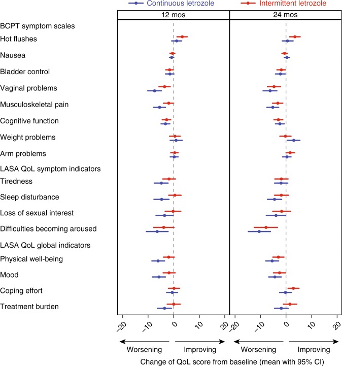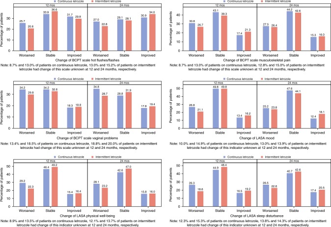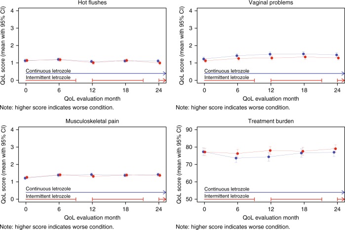 Results: There was no difference in hot flushes at 12 months between the two schedules, but patients receiving intermittent letrozole reported significantly more improvement at 24 months. They also indicated less worsening in vaginal problems, musculoskeletal pain, sleep disturbance, physical well-being and mood at 12 months. Overall, 25-30% of patients reported a clinically relevant worsening in key symptoms and global QoL.