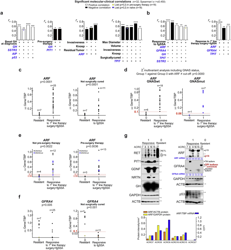Interpretation: Tumor ARF mRNA expression measured at the time of the surgery is a prognosis factor in acromegaly. The RET inhibitor, Sorafenib, is proposed as a potential treatment for resistant ACRO. FUND: This project was supported by national grants from Agencia Estatal de Investigación (AEI) and Instituto Investigación Carlos III, with participation of European FEDER funds, to IB (PI150056) and CVA (BFU2016-76973-R). It was also supported initially by a grant from the Investigator Initiated Research (IIR) Program (WI177773) and by a non-restricted Research Grant from Pfizer Foundation to IB. Some of the pituitary acromegaly samples were collected in the framework of the Spanish National Registry of Acromegaly (REMAH), partially supported by an unrestricted grant from Novartis to the Spanish Endocrine Association (SEEN). CVA is also supported from a grant of Medical Research Council UK MR/M018539/1.