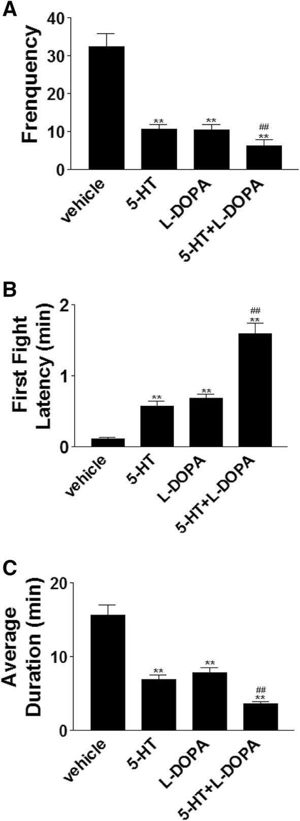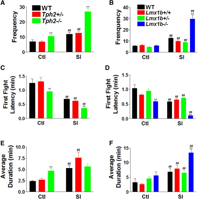 Isolation rearing (IR) enhances aggressive behavior, and the central serotonin (5-hydroxytryptamine, 5-HT) system has been linked to IR-induced aggression. However, whether the alteration of central serotonin is the cause or consequence of enhanced aggression is still unknown. In the present study, using mice deficient in central serotonin Tph2-/- and Lmx1b-/-, we examined the association between central serotonin and aggression with or without social isolation. We demonstrated that central serotonergic neurons are critical for the enhanced aggression after IR. 5-HT depletion in wild-type mice increased aggression. On the other hand, application of 5-HT in Lmx1b-/- mice inhibited the enhancement of aggression under social isolation conditions. Dopamine was downregulated in Lmx1b-/- mice. Similar to 5-HT, L-DOPA decreased aggression in Lmx1b-/- mice. Our results link the serotoninergic system directly to aggression and this may have clinical implications for aggression-related human conditions.
