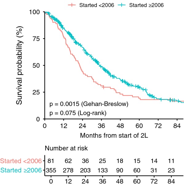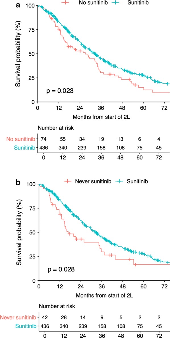 Results: Median OS from start of 2L therapy was 32.4 months for sunitinib (n = 436) compared with 27.1 months for patients treated with any other 2L drug (n = 74, p = 0.023, HR 1.377) and 16.8 months for patients who never received sunitinib in any treatment line (n = 42, p = 0.028, HR 1.52). In patients reporting progression in 2L, the median OS in patients subsequently receiving 3L regorafenib (n = 53, 26.2 months) was longer than that of 3L patients who never received regorafenib in any line of therapy (n = 174, 14.3 months, p = 0.0002, HR 2.231), and was longer than that of patients who received any other 3L treatment (19.8 months, p = 0.044, HR 1.525). OS for advanced GIST patients in the LRG registry has improved over time (p = 0.0013), correlated with the increased use of TKIs in ≥ 2L settings.