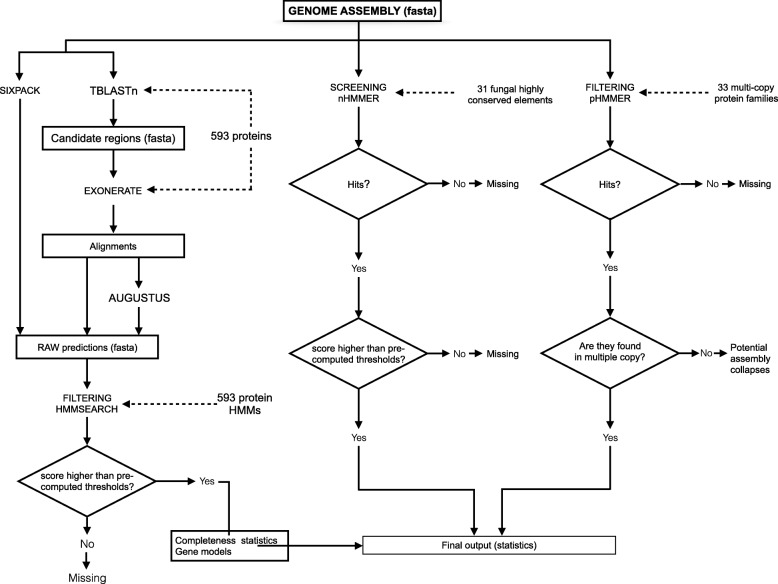 Results: We propose a computational framework and sequence resource for assessing completeness of fungal genomes called FGMP (Fungal Genome Mapping Project). Our approach is based on evolutionary conserved sets of proteins and DNA elements and is applicable to various types of genomic data. We present a comparison of FGMP and state-of-the-art methods for genome completeness assessment utilizing 246 genome assemblies of fungi. We discuss genome assembly improvements/degradations in 57 cases where assemblies have been updated, as recorded by NCBI assembly archive.