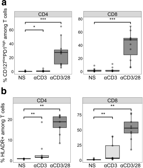 Results: In patients, neither CD127 expression nor its corresponding mRNA transcript level was modified compared with normal values. However, the percentage of CD127lowPD-1high T cells was increased while T cells also presented functional alterations. CD127lowPD-1high T cells co-expressed HLA-DR, an activation marker, suggesting a role for T-cell activation in the development of this phenotype. Indeed, T-cell receptor (TCR) activation of normal T lymphocytes ex vivo reproduced the increase of CD127lowPD-1high T cells and functional alterations following a second stimulation, as observed in patients. Finally, in this model, as observed in patients, IL-7 could improve T-cell proliferation.