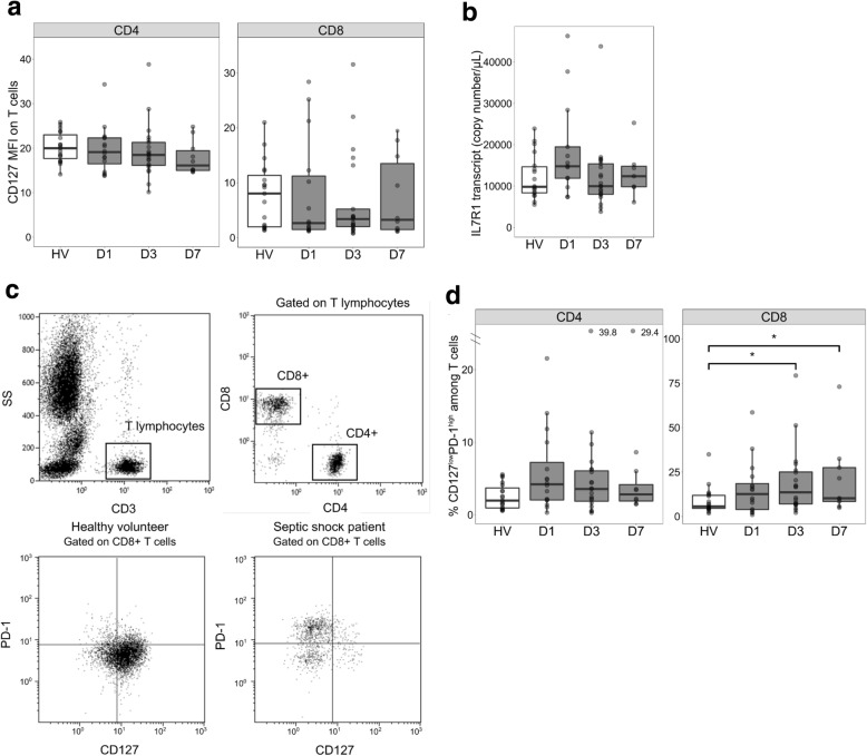 Methods: CD127 expression was followed at the protein and mRNA levels in patients with septic shock and healthy volunteers. CD127lowPD-1high phenotype was also evaluated in parallel with T-cell functional alterations after ex vivo activation. To reproduce T-cell alterations observed in patients, purified T cells from healthy volunteers were activated ex vivo and their phenotype and function were evaluated.