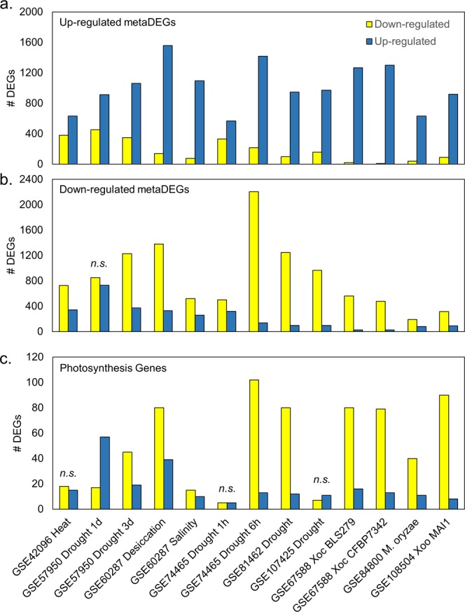 Environmental stresses greatly limit crop yield. With the increase in extreme weather events due to climate change and the constant pressure of diseases and pests, there is an urgent need to develop crop varieties that can tolerate multiple stresses. However, our knowledge of how plants broadly respond to stress is limited. Here, we explore the rice core stress response via meta-analysis of publicly available rice transcriptome data. Our results confirm that rice universally down-regulates photosynthesis in response to both abiotic and biotic stress. Rice also generally up-regulates hormone-responsive genes during stress response, most notably genes in the abscisic acid, jasmonic acid and salicylic acid pathways. We identified several promoter motifs that are likely involved in stress-responsive regulatory mechanisms in rice. With this work, we provide a list of candidate genes to study for improving rice stress tolerance in light of environmental stresses. This work also serves as a proof of concept to show that meta-analysis of diverse transcriptome data is a valid approach to develop robust hypotheses for how plants respond to stress.