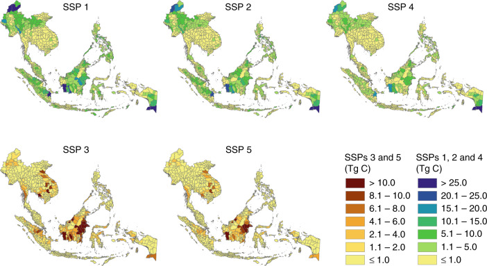 While Southeast Asia's forests play important roles in biodiversity conservation and global carbon (C) balance, the region is also a deforestation hotspot. Here, we consider the five shared socioeconomic pathways (SSPs) to portray a range of plausible futures for the region's forests, employing a state-of-the-art land change modelling procedure and remotely sensed data. We find that by 2050 under the worst-case scenario, SSP 3 (regional rivalry/a rocky road), the region's forests would shrink by 5.2 million ha. The region's aboveground forest carbon stock (AFCS) would decrease by 790 Tg C, 21% of which would be due to old-growth forest loss. Conversely, under the best-case scenario, SSP 1 (sustainability/taking the green road), the region is projected to gain 19.6 million ha of forests and 1651 Tg C of AFCS. The choice of the pathway is thus critical for the future of the region's forests and their ecosystem functions and services.