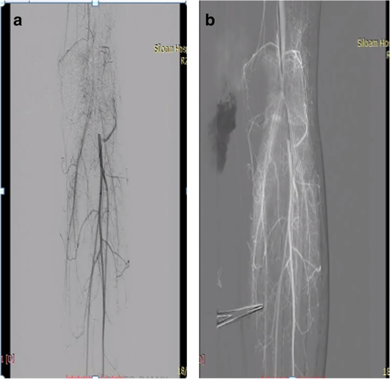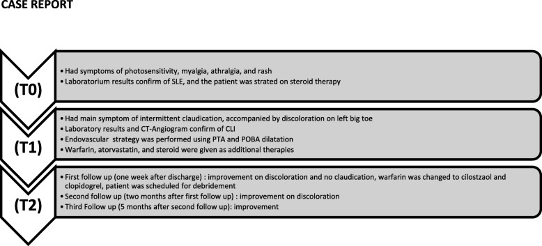 Case presentation: A 14-year-old Asian girl presented with intermittent claudication as the chief complaint followed by discoloration of her left big toe for 2 weeks prior to admission. Her medical history showed that 1 month prior to admission she had photosensitivity, rash, and arthralgia, with positive antinuclear antibody test, positive anti-double-stranded DNA test, positive anti-ribosomal protein P, and complement C4 (7.4 mg/dL); she was diagnosed as having systemic lupus erythematosus and started therapy. A local examination of her left toe showed black discoloration, low pulsation, localized tenderness, and decreased sensation. Laboratory results showed C-reactive protein of 1.16 mg/dL and D-dimer of 2.28 uG/mL. A computed tomography angiogram showed near total occlusion of her popliteal artery; critical limb ischemia was confirmed. Peripheral arteriography was performed with invasive strategy. After the procedure, the flow was improved to distal, but there was inflammation in the vessel, so we decided to stop the procedure because of the risk of dissection. Our patient was given atorvastatin and warfarin, and we maximized her systemic lupus erythematosus therapy with prednisone. There were two follow-ups. The first follow-up was 1 week after the procedure. Our patient attended her first follow-up at our out-patient department with no symptoms and improvement in her toe's discoloration; warfarin was stopped, and clopidogrel and cilostazol were added for thrombus prevention therapy, she was then scheduled for debridement. The second follow-up was done 2 months after the first follow-up and discoloration was improved. The third follow-up, 5 months after the second follow-up, showed improvement.