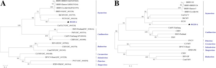 Results: Based on high throughput sequencing of virus-derived small RNAs (vsRNA), we identified the sequence a new-to-science double-strand DNA virus isolated from water chestnut cv. 'Tuanfeng' samples, a widely grown cultivar in Hubei province, China, and analyzed its genomic organization. The complete genomic sequence is 7535 base-pairs in length, and shares 42-52% nucleotide sequence identity with viruses in the Caulimoviridae family. The virus contains nine predicated open reading frames (ORFs) encoding nine hypothetical proteins, with conserved domains characteristic of caulimoviruses. Phylogenetic analyses at the nucleotide and amino acid levels indicated that the virus belongs to the genus Soymovirus. The virus is tentatively named Water chestnut soymovirus-1 (WCSV-1). Phylogenetic analysis of the putative viral polymerase protein suggested that WCSV-1 is distinct to other well established species in the Soymovirus genus. This conclusion was supported by phylogenetic analyses of the amino acid sequences encoded by ORFs I, IV, VI, or VII. The sRNA bioinformatics showed that the majority of the vsRNAs are 22-nt in length with a preference for U at the 5'-terminal nucleotide. The vsRNAs are unevenly distributed over both strands of the entire WCSV-1 circular genome, and are clustered into small defined regions. In addition, we detected WCSV-1 in asymptomatic and symptomatic water chestnut samples collected from different regions of China by using PCR. RNA-seq assays further confirmed the presence of WCSV-1-derived viral RNA in infected plants.