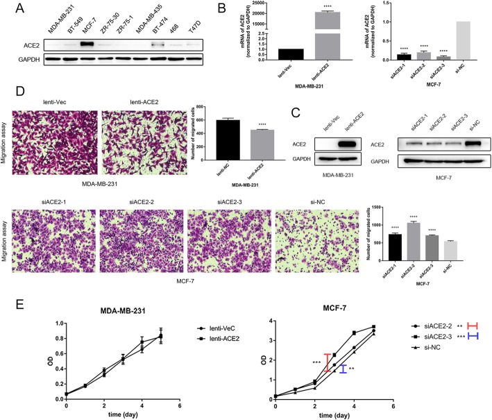 Background: Breast cancer angiogenesis is key for metastasis and predicts a poor prognosis. Angiotensin-converting enzyme 2 (ACE2), as a member of the renin-angiotensin system (RAS), was reported to restrain the progression of hepatocellular carcinoma (HCC) and non-small cell lung cancer (NSCLC) through inhibiting angiogenesis. However, the relationship between ACE2 and breast cancer angiogenesis remains unclear.