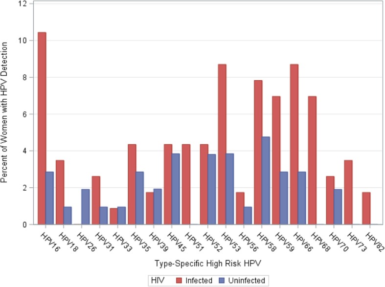 Methods: Women without cervical dysplasia were enrolled in a longitudinal study. Data from enrollment are presented as a cross-sectional analysis. Demographic and behavioral data was collected, and HPV typing was performed on cervical swabs. HIV-uninfected women (n = 105) and HIV-infected women (n = 115) were compared for demographic and behavioral characteristics using t-tests, Chi-square tests, Wilcoxon sum rank tests or Fisher's exact tests, and for HPV detection using logistic regression or negative binomial models adjusted for demographic and behavioral characteristics using SAS 9.4 software.