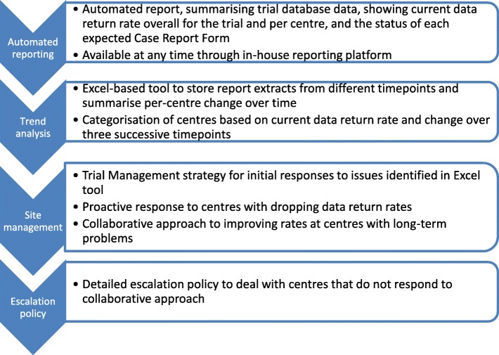 Methods: We report novel methods from the Trial of Imaging and Schedule in Seminoma Testis (TRISST), a UK-based, multi-centre, phase III trial using paper Case Report Forms to collect data over a 6-year follow-up period for 669 patients. Using an automated database report which summarises the data return rate overall and per centre, we developed a Microsoft Excel-based tool to allow observation of per-centre trends in data return rate over time. The tool allowed us to distinguish between forms that can and cannot be completed retrospectively, to inform understanding of issues at individual centres. We reviewed these statistics at regular trials unit team meetings. We notified centres whose data return rate appeared to be falling, even if they had not yet crossed the pre-defined acceptability threshold of an 80% data return rate. We developed a set method for agreeing targets for gradual improvement with centres having persistent data return problems. We formalised a detailed escalation policy to manage centres who failed to meet agreed targets. We conducted a post-hoc, descriptive analysis of the effectiveness of the new processes.