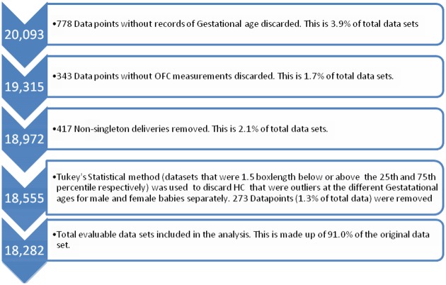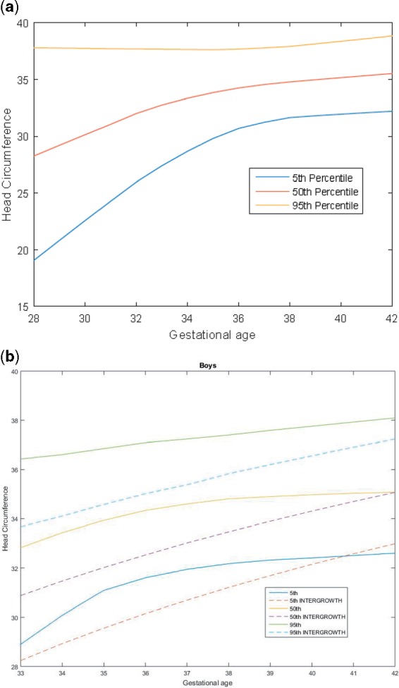Subjects and methods: We reviewed birth records of all infants at the Jos University Teaching Hospital (JUTH) over a 10 year period from January 2006. JUTH is a tertiary care center offering obstetric services to a large population of women in Jos and its environs. All births with gestational age between 28 and 42 weeks were included in the study. STATA version 14 was used to calculate gestational age associated HC percentile measurements.