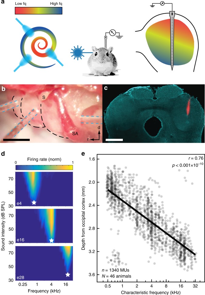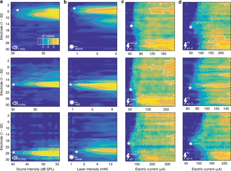 Cochlear implants (CIs) electrically stimulate spiral ganglion neurons (SGNs) and partially restore hearing to half a million CI users. However, wide current spread from intracochlear electrodes limits spatial selectivity (i.e. spectral resolution) of electrical CIs. Optogenetic stimulation might become an alternative, since light can be confined in space, promising artificial sound encoding with increased spectral selectivity. Here we compare spectral selectivity of optogenetic, electric, and acoustic stimulation by multi-channel recordings in the inferior colliculus (IC) of gerbils. When projecting light onto tonotopically distinct SGNs, we observe corresponding tonotopically ordered IC activity. An activity-based comparison reveals that spectral selectivity of optogenetic stimulation is indistinguishable from acoustic stimulation for modest intensities. Moreover, optogenetic stimulation outperforms bipolar electric stimulation at medium and high intensities and monopolar electric stimulation at all intensities. In conclusion, we demonstrate better spectral selectivity of optogenetic over electric SGN stimulation, suggesting the potential for improved hearing restoration by optical CIs.