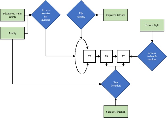 Results: The estimated regression relationship between community-level TF and TT was significant in eight countries. We estimate that a 10% increase in community-level TF prevalence leads to an increase in the odds for TT ranging from 20 to 86% when accounting for additional covariates.