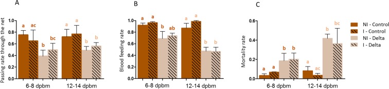 Within mosquito vector populations, infectious mosquitoes are the ones completing the transmission of pathogens to susceptible hosts and they are, consequently, of great epidemiological interest. Mosquito infection by malaria parasites has been shown to affect several traits of mosquito physiology and behavior, and could interplay with the efficacy of control tools. In this study, we evaluated, in pyrethroid resistant Anopheles gambiae, the effect of mosquito infection with the human malaria parasite Plasmodium falciparum on the efficacy of nets treated with either the insecticide deltamethrin or the repellent DEET, measuring (i) mosquito success to pass through the net, (ii) blood-feeding on a host and (iii) chemicals-induced mortality. Infection of mosquitoes at non-infectious stage did not affect their success to pass through the net, to blood-feed, nor chemicals-induced mortality. At infectious stage, depending on replicates, infected mosquitoes had higher mortality rates than uninfected mosquitoes, with stronger effect in presence of DEET. This data evidenced a cost of infection on mosquito survival at transmissible stages of infection, which could have significant consequences for both malaria epidemiology and vector control. This stresses the need for understanding the combined effects of insecticide resistance and infection on the efficacy on control tools.