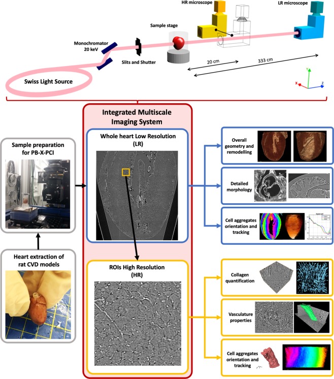 Cardiovascular diseases (CVDs) affect the myocardium and vasculature, inducing remodelling of the heart from cellular to whole organ level. To assess their impact at micro and macroscopic level, multi-resolution imaging techniques that provide high quality images without sample alteration and in 3D are necessary: requirements not fulfilled by most of current methods. In this paper, we take advantage of the non-destructive time-efficient 3D multiscale capabilities of synchrotron Propagation-based X-Ray Phase Contrast Imaging (PB-X-PCI) to study a wide range of cardiac tissue characteristics in one healthy and three different diseased rat models. With a dedicated image processing pipeline, PB-X-PCI images are analysed in order to show its capability to assess different cardiac tissue components at both macroscopic and microscopic levels. The presented technique evaluates in detail the overall cardiac morphology, myocyte aggregate orientation, vasculature changes, fibrosis formation and nearly single cell arrangement. Our results agree with conventional histology and literature. This study demonstrates that synchrotron PB-X-PCI, combined with image processing tools, is a powerful technique for multi-resolution structural investigation of the heart ex-vivo. Therefore, the proposed approach can improve the understanding of the multiscale remodelling processes occurring in CVDs, and the comprehensive and fast assessment of future interventional approaches.