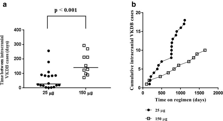 Vitamin K prophylaxis in infancy aims to prevent life-threatening vitamin K deficiency bleeding (VKDB). The Dutch prophylactic oral daily regimen was increased sixfold from 25 to 150 μg because of a high failure rate. To evaluate the efficacy of this new regimen, incidences of intracranial VKDB under both regimens were compared using both general and targeted surveillance. Late VKDB in the general pediatric population was identified by the Netherlands Pediatric Surveillance Unit, between 1 October 2014 and 31 December 2016. Additionally, infants with intracranial vitamin K deficiency bleeding were identified using the Dutch Pediatric Intensive Care Evaluation registry. The incidence of intracranial VKDB as assessed by general and targeted surveillance decreased from 1.6 per 100,000 (95% CI, 0.4-5.1) to 1.3 per 100,000 (95% CI, 0.5-3.2) and from 3.1 per 100,000 live births (95% CI, 1.9-5.0) to 1.2 per 100,000 live births (95% CI, 0.6-2.3), respectively. Median time between consecutive cases in the latter increased from 24 to 154 days (p < 0.001).Conclusion: A sixfold increase in oral vitamin K prophylaxis was associated with a surprisingly modest reduction in the incidence of intracranial VKDB, indicating that factors other than the dose need addressing to improve efficacy. What is Known: • The efficacy of intramuscular vitamin K prophylaxis is threatened by an increasing number of parents opting out. • Oral prophylaxis represents an attractive and less invasive alternative but is inferior, especially in infants with malabsorption of vitamin K due to cholestasis. What is New: • Increasing the daily oral dose of vitamin K sixfold had a surprisingly modest effect on the incidence of late vitamin K deficiency bleeding. • This finding indicates that factors other than the dose must play an important role.
