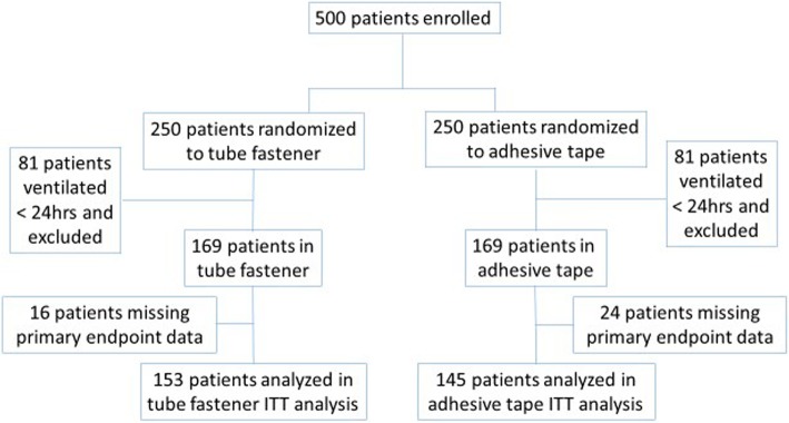 Methods: In this pragmatic, single-center, randomized trial, critically ill adults admitted to the medical intensive care unit (MICU) and expected to require invasive mechanical ventilation for greater than 24 h were randomized to adhesive tape or endotracheal tube fastener at the time of intubation. The primary endpoint was a composite of any of the following: presence of lip ulcer, endotracheal tube dislodgement (defined as moving at least 2 cm), ventilator-associated pneumonia, or facial skin tears anytime between randomization and the earlier of death or 48 h after extubation. Secondary endpoints included duration of mechanical ventilation and ICU and in-hospital mortality.
