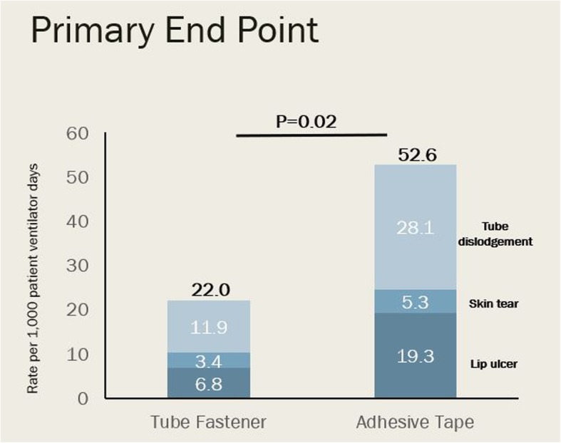 Results: Of 500 patients randomized over a 12-month period, 162 had a duration of mechanical ventilation less than 24 h and 40 had missing outcome data, leaving 153 evaluable patients randomized to tube fastener and 145 evaluable patients randomized to adhesive tape. Baseline characteristics were similar between the groups. The primary endpoint occurred 13 times in 12 (7.8%) patients in the tube fastener group and 30 times in 25 (17.2%) patients in the adhesive tape group (p = 0.014) for an overall incidence of 22.0 versus 52.6 per 1000 ventilator days, respectively (p = 0.020). Lip ulcers occurred in 4 (2.6%) versus 11 (7.3%) patients, or an incidence rate of 6.5 versus 19.5 per 1000 patient ventilator days (p = 0.053) in the fastener and tape groups, respectively. The endotracheal tube was dislodged 7 times in 6 (3.9%) patients in the tube fastener group and 16 times in 15 (10.3%) patients in the tape group (p = 0.03), reflecting incidences of 11.9 and 28.1 per 1000 ventilator days, respectively. Facial skin tears were similar between the groups. Mechanical ventilation duration and ICU and hospital mortality did not differ.
