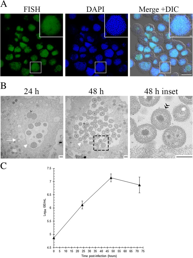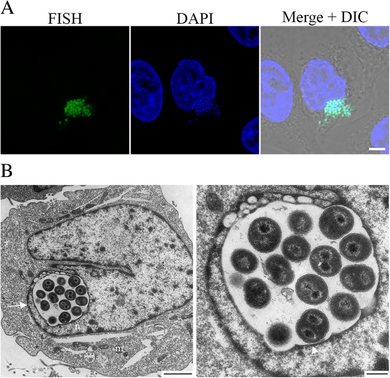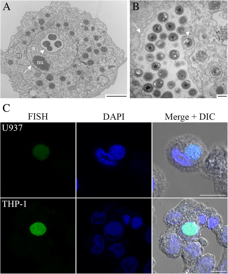 Results: Transmission electron microscopy (TEM) and confocal microscopy were used to confirm nuclear co-localization of 'Ca. B. cookevillensis' in the amoeba host A. polyphaga with 100% of cells having bacteria co-localized with host nuclei by 48 h. TEM and confocal microscopy demonstrated that the bacterium was also observed to be closely associated with nuclei of human U937 and THP-1 differentiated macrophage cell lines and nonphagocytic HeLa human epithelial-like cells. Immunofluorescent staining revealed that the bacteria-containing vacuole invaginates the nuclear membranes and appears to cross from the cytoplasm into the nucleus as an intact vacuole.