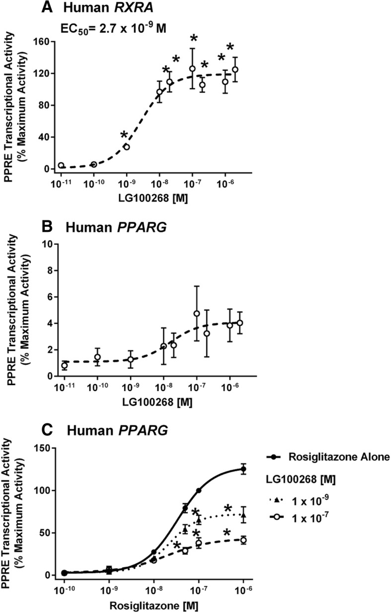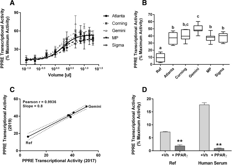 Results: Cos-7 cells endogenously express sufficient RXR to support efficacious activation of transfected PPARγ. Co-transfection of an RXR expression vector with the PPARγ expression vector did not increase PPRE transcriptional activity induced by rosiglitazone. Treatment with an RXR ligand marginally increased PPRE transcriptional activity in the presence of transfected PPARγ, and co-treatment with an RXR ligand reduced rosiglitazone-induced PPRE transcriptional activity. Therefore, the final bioassay protocol consists of transfecting Cos-7 cells with a PPARγ expression vector along with the reporter vectors, applying rosiglitazone standards and/or 10 μL of serum, and measuring luminescence and fluorescence after a 24 h incubation. Sera from mice dosed with rosiglitazone induced PPRE transcriptional activity in the SPAA in a dose-dependent and PPARγ-dependent manner. Additionally, human serum from commercial sources induced a range of PPRE transcriptional activities in a PPARγ-dependent manner, demonstrating the ability of the bioassay to detect potentially low levels of ligands.