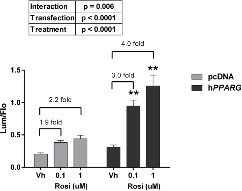 Methods: First, we determined essential components of the bioassay. Cos-7 cells were transfected with combinations of expression vectors for human PPARγ and RXRα, the obligate DNA-binding partner of PPARγ, along with PPRE (DR1)-driven luciferase and control eGFP reporter constructs. Transfected cells were treated with rosiglitazone, a synthetic PPARγ ligand and/or LG100268, a synthetic RXR ligand, to characterize the dose response and determine the simplest and most efficacious format. Following optimization of the bioassay, we assessed the cumulative activation of PPARγ by ligands in serum from mice treated with a PPARγ ligand and commercial human serum samples.