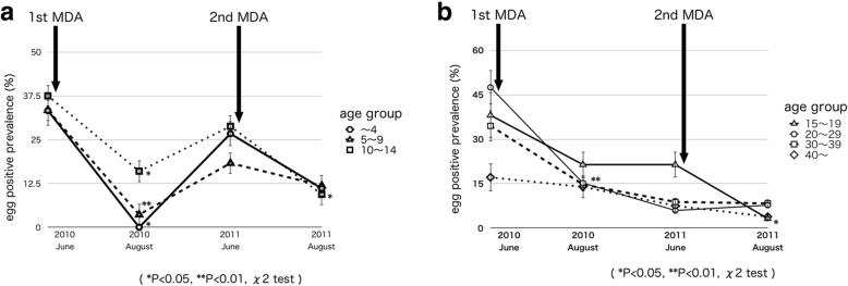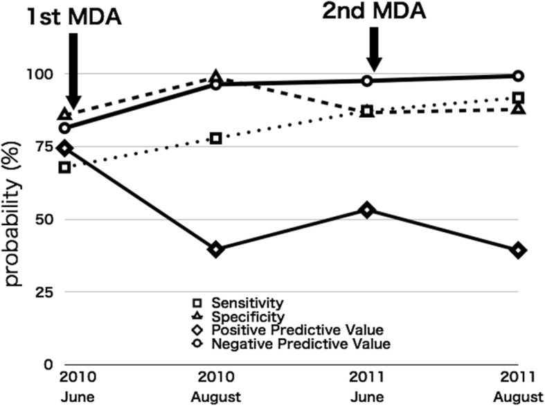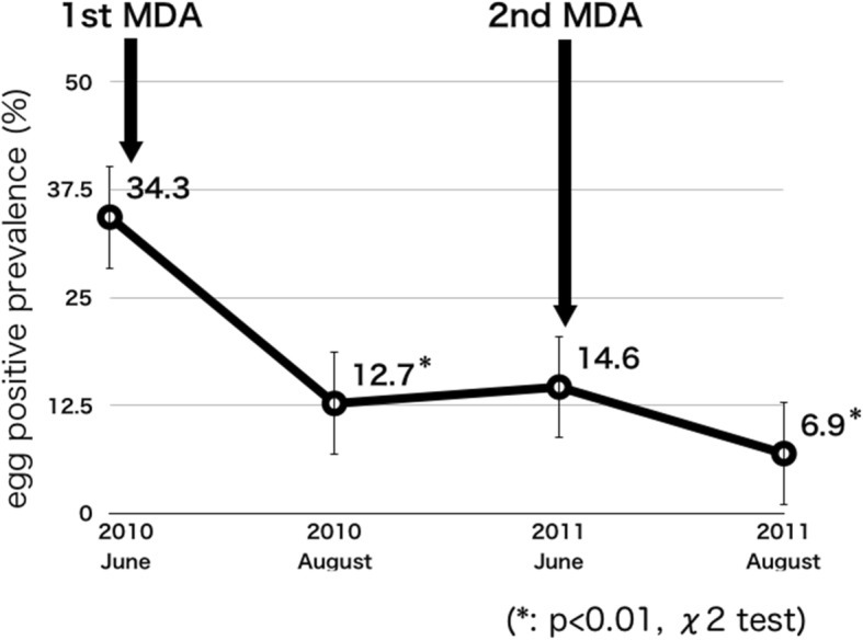 Results: The egg-positive prevalence was 34.3% (95% CI 28.5-40.5) just before MDA in June 2010 and the highest prevalence was in the age of twenties. The egg-positive prevalence reduced to 12.7% (95% CI 9.2-17.3, p < 0.01) 8 weeks after the first MDA and the prevalence reduced to 6.9% (95% CI 4.6-10.0, p < 0.01) after the second MDA in August 2011. The egg-positive prevalence after MDA in 2013 was reduced from 3.8% (95% CI 2.1-6.9) to 0.9% (95% CI 0.3-3.4) and p value was 0.050. Using urine reagent strips after MDA, the positive predictive value decreased, but the negative predictive value remained high. The cost of one urine reagent strip and one tablet of praziquantel were US$0.06 and US$0.125 in 2013 in Malawi. If the egg-positive prevalence is 40%, screening subjects for MDA using urine reagent strips, the cost reduction can be estimated to be about 24%, showing an overall cost reduction.