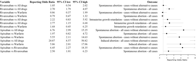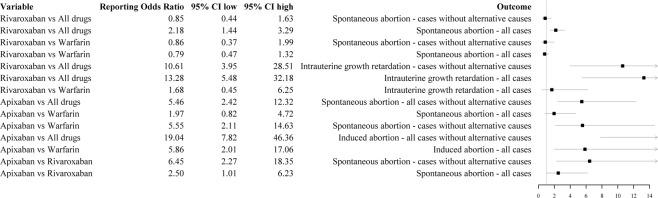 We aimed to perform an analysis of individual case safety reports retrieved after the Standardized MedDRA Query "Pregnancy and neonatal topics" for which Direct-Acting Oral Anticoagulants (DOACs) were claimed as suspected/interacting drugs. Additionally, to investigate if exists a disproportion of cases reporting "Pregnancy and neonatal topics" adverse events rather than other adverse events for DOACs in comparison with all other drugs registered in VigiBase or warfarin. VigiBase, the World Health Organization (WHO)'s global database of individual case safety reports was used as data source. Forty-two cases of abortion were detected of which 18 (42.8%) had alternative causes for its occurrence. Fourteen cases reported congenital anomaly (8 cases) or low birth weight baby/fetal growth restriction (6 cases) of which 62.5% and 33.3% had at least one confounder, respectively. In the disproportionality analyses, a potential safety signal for spontaneous abortion emerged for rivaroxaban (Reporting Odds Ratio, ROR 2.70; 95% CI 1.79-4.07) and apixaban (ROR 6.76; 95% CI 2.99-15.25). However, when the same analyses were performed using only cases without alternative causes, no statistically significant associations for rivaroxaban when compared to all other drugs (ROR 1.05; 95% CI 0.54-2.02) or warfarin (ROR 0.79; 95% CI 0.47-1.32) were found. For apixaban, we found a statistically significant ROR for induced abortion when compared to all other drugs or warfarin. For the majority of cases claiming DOACs-induced teratogenic effects, spontaneous or induced abortion there was at least one alternative cause explaining the occurrence of the adverse events. For rivaroxaban, when cases without confounders were considered, no safety signals emerged. However, for apixaban, we found a potential safety signal suggesting an increased probability of reporting spontaneous/induced abortion rather than other events when compared to all other drugs or warfarin.